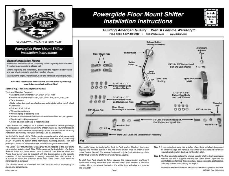 Floor Mount Shifter; Floor; 23 in. Lever; Lokar Hi-Tech Shift Knob; For Use w/Powerglide Transmission; Incl. Lever/Brackets/Neutral Safety Switch/Hardware;